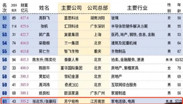 另有消息称,在2020新财富500富人榜榜单中,29岁的张康阳与张近东一起排名第61位,是上榜候选人中第二年轻的。最年轻的入围候选人为27岁的章泽天,与刘强东并列第31位。